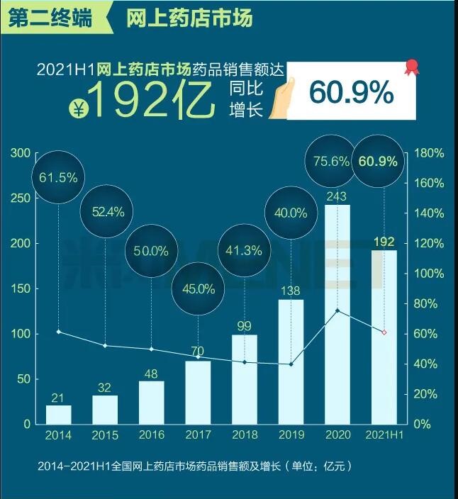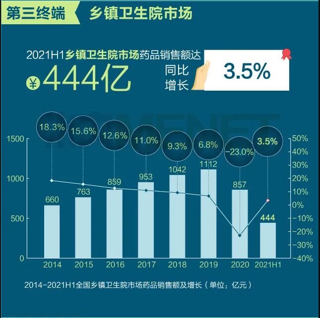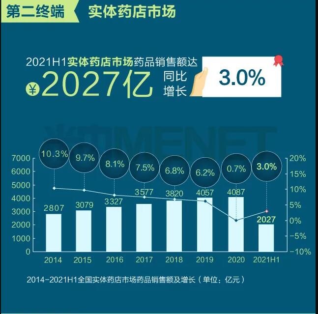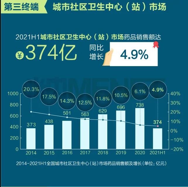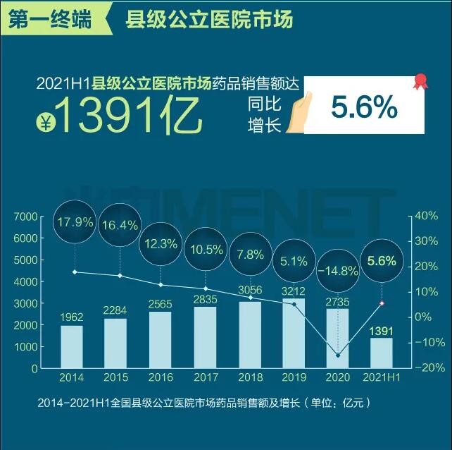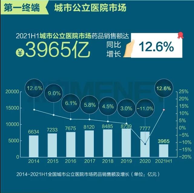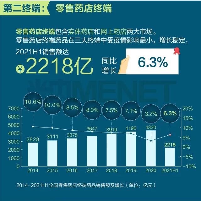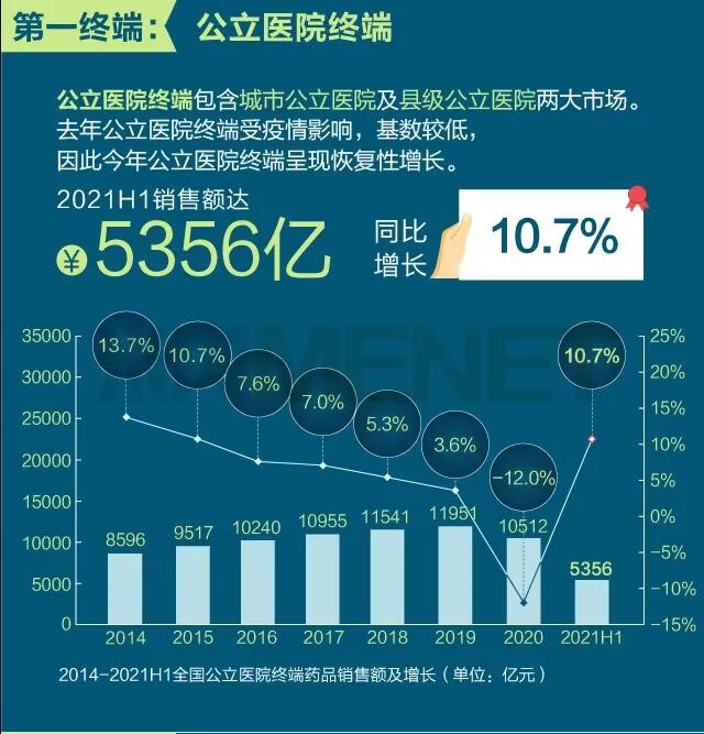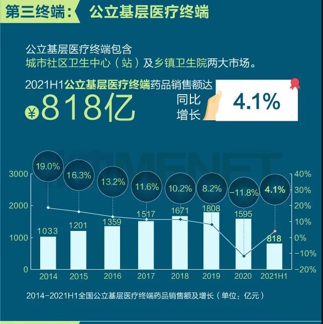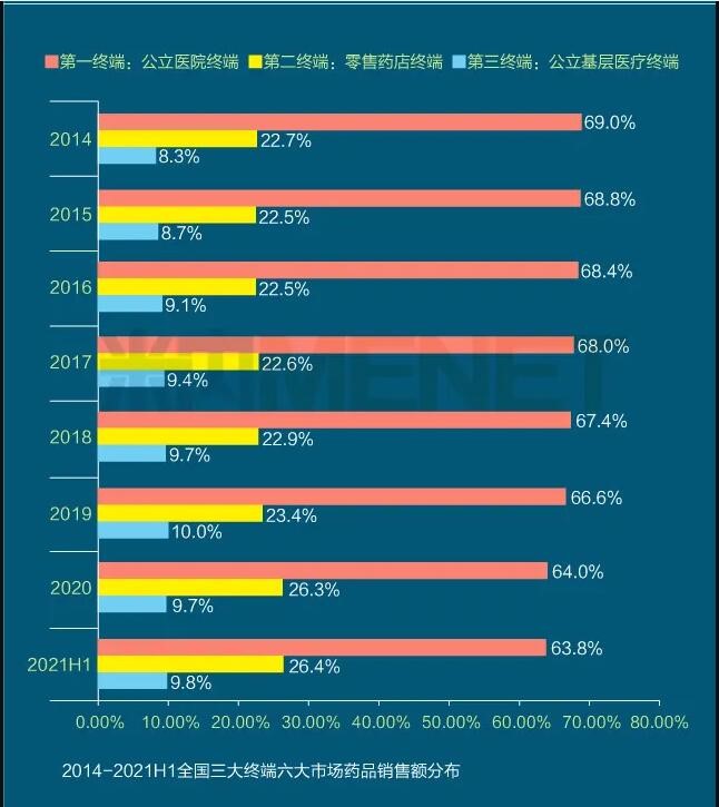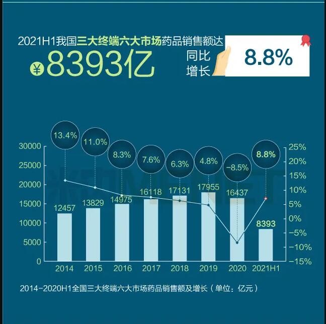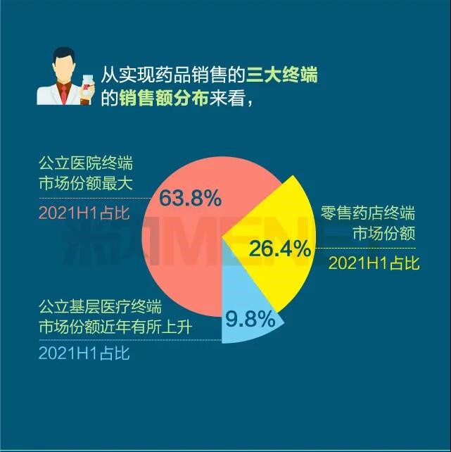 2021年上半年我國(guó)三大終端六大市場(chǎng)(定義范圍詳見(jiàn)文末“數(shù)據(jù)說(shuō)明”)藥品銷(xiāo)售額達(dá)8393億元,同比增長(zhǎng)8.8%。從實(shí)現(xiàn)藥品銷(xiāo)售的三大終端的銷(xiāo)售額分布來(lái)看,公立醫(yī)院終端市場(chǎng)份額最大,2021上半年占比為63.8%;零售藥店終端市場(chǎng)份額2021上半年占比為26.4%;公立基層醫(yī)療終端市場(chǎng)份額2021上半年占比為9.8%。以上統(tǒng)計(jì)數(shù)據(jù)未包含“民營(yíng)醫(yī)院、私人診所、村衛(wèi)生室”。